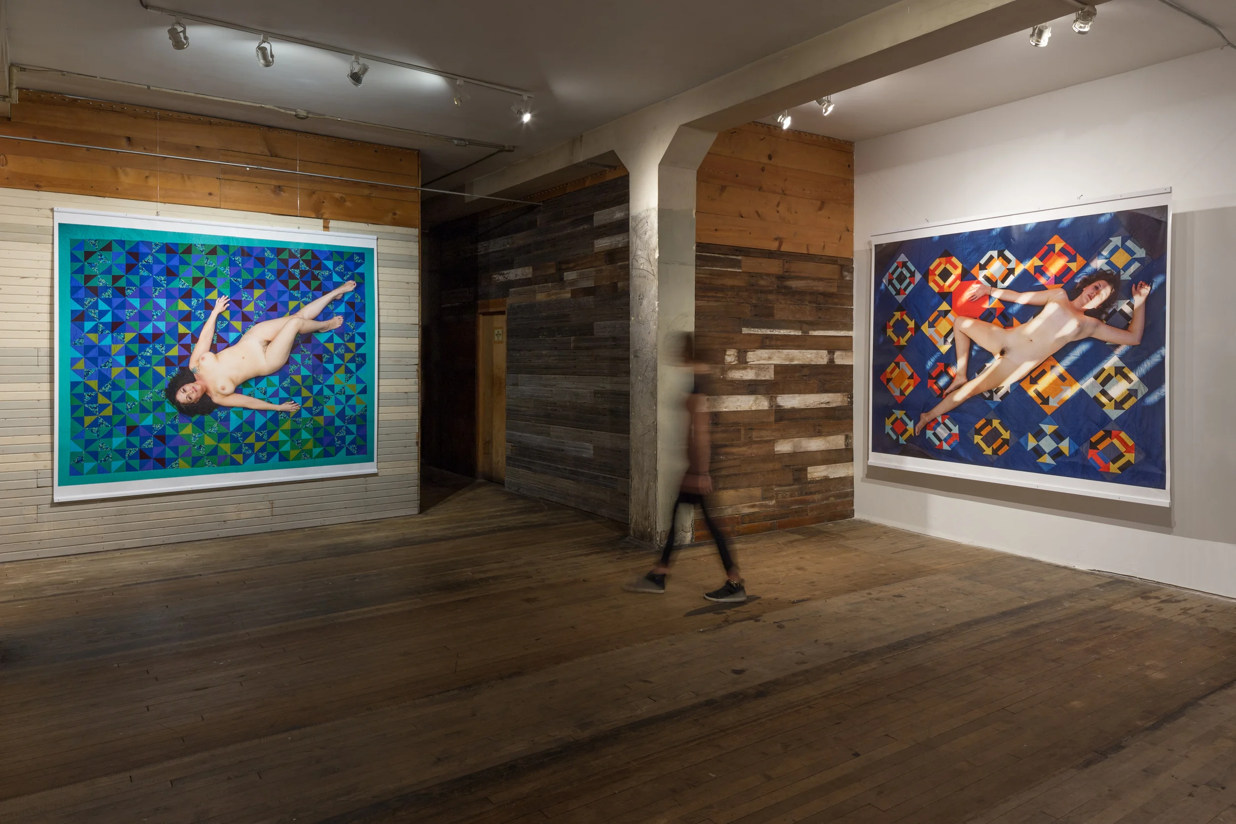 The Odalisques are a series of horizontal, reclining female nudes that pay homage to the French Nineteenth Century voluptuaries frequently depicted in paintings, including Olympia by Manet. The Odalisques are all lying on quilts handmade by Marlos, and the elements of the photographs are stripped down to the figure, the ground and light. The perspective is flat and they are shot from a “god’s eye view”, hovering high above. They defy gravity. Their scale is critical. The quilts are reproduced 1:1, rendering the Odalisques life-sized so the viewer interacts with the photographs on the same scale that a real life encounter would produce. The Odalisques are beautiful and unapologetic
